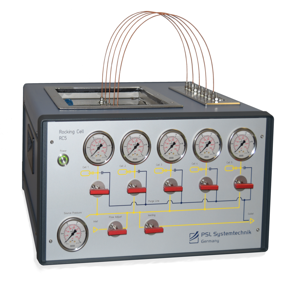 Rocking Cell System RC5-Automated hydrate test system for inhibitor screening and compatibility testing.The Rocking Cell uses one of the most stringent condition of the currentlyaccepted methods for research on hydrate inhibitors and influence of corrosion inhibitors. The measuring principleof the rocking cell is based on the steady tilting of cooled, pressurised test cells (rocking cells).